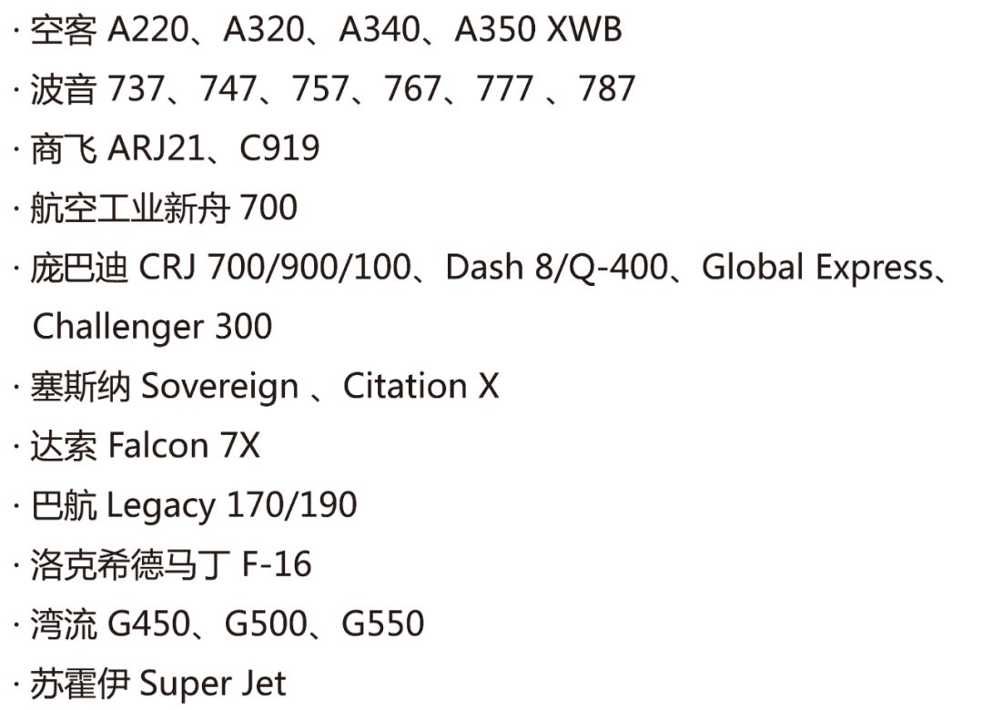 派克宇航生產(chǎn)的液壓部件被眾多飛機制造商廣泛采用,覆蓋不同飛機系列。如下機型更是采用了派克宇航的全套液壓系統(tǒng):波音787夢想飛機,空客350XWB飛機,商飛ARJ21支線飛機和C919大飛機,航空工業(yè)新舟700飛機,空客A220/230 (之前的龐巴迪C系列),蘇霍伊Super客機、巴航170/190/195,龐巴迪Dash8/Q400/CRJ900等民用運輸機,巴航Legacy 450/500、達索獵鷹7X、龐巴迪Global 5000/7000/8000等公務(wù)機。