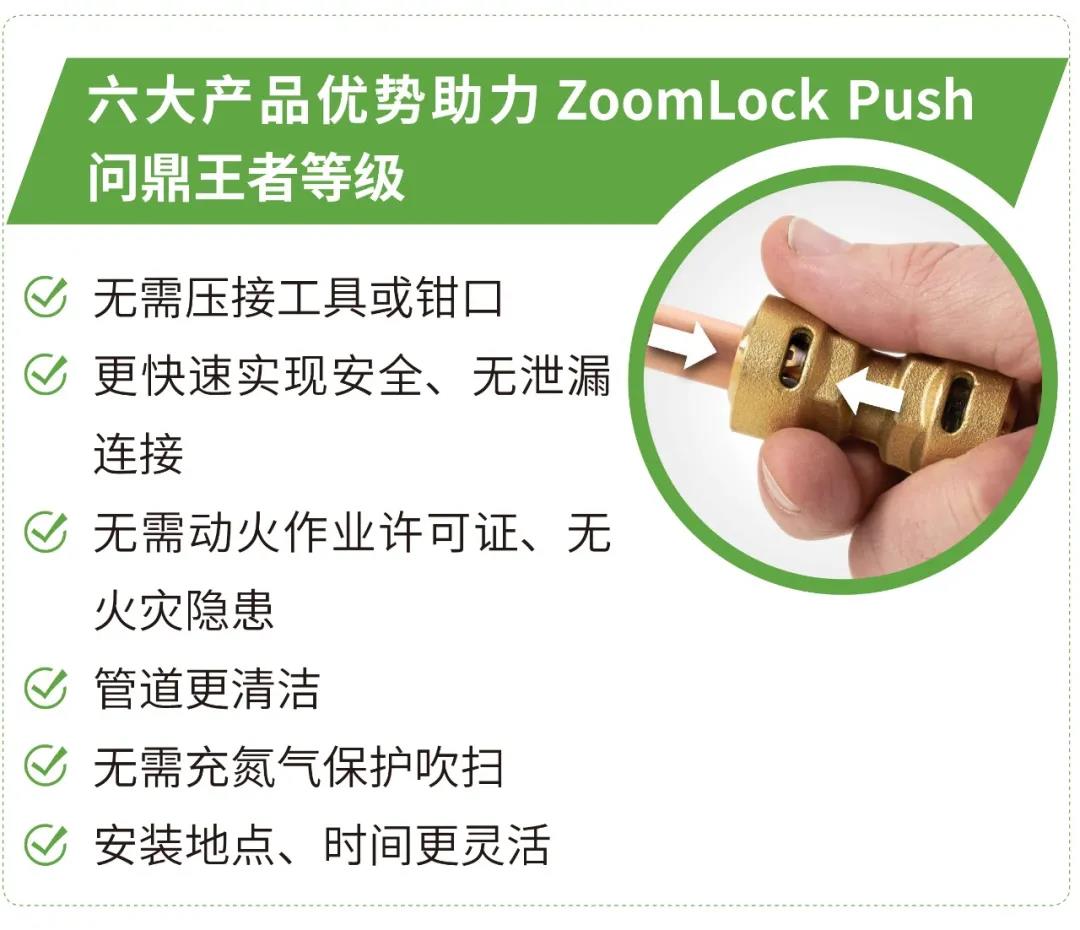 如果空調(diào)制冷管路連接技術(shù)也有段位的話,那么ZoomLock Push推入/按壓式接頭一定是王者等級!它不僅延續(xù)原ZoomLock產(chǎn)品的尊貴血統(tǒng),堅守安全、清潔的無泄漏連接品質(zhì),更另辟蹊徑,進(jìn)一步加速管道安裝。